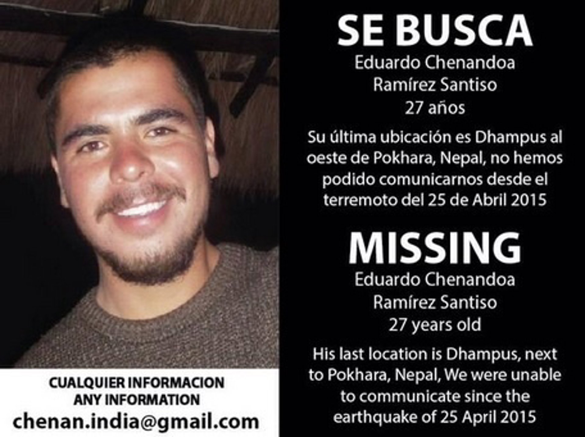El mexicano Eduardo Chenandoa de 27 años, que se encontraba en Nepal desde el pasado 30 de marzo, está en paradero desconocido desde este sábado cuando el país sufrió un terremoto que ha dejado más de 2.500 muertos.