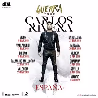 El artista mexicano Carlos Rivera anuncia este viernes que actuará en once ciudades españolas durante 2019 dentro de la gira de presentación de su nuevo álbum, titulado 'Guerra'. Las entradas estarán a la venta el miércoles 12 de septiembre a las 12:00 horas en puntos habituales.