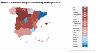 Castilla y León (+5,8%) es la comunidad autónoma que lidera el aumento de la criminalidad en 2025, seguida de cerca por Baleares (+5,6%) y Asturias (+5,4%). Sólo hay cinco regiones en las que bajan los delitos con respecto al año pasado, siendo Cataluña (-2,9%) y Comunidad de Madrid (-1,7%) las que anotan las bajadas más significativas.