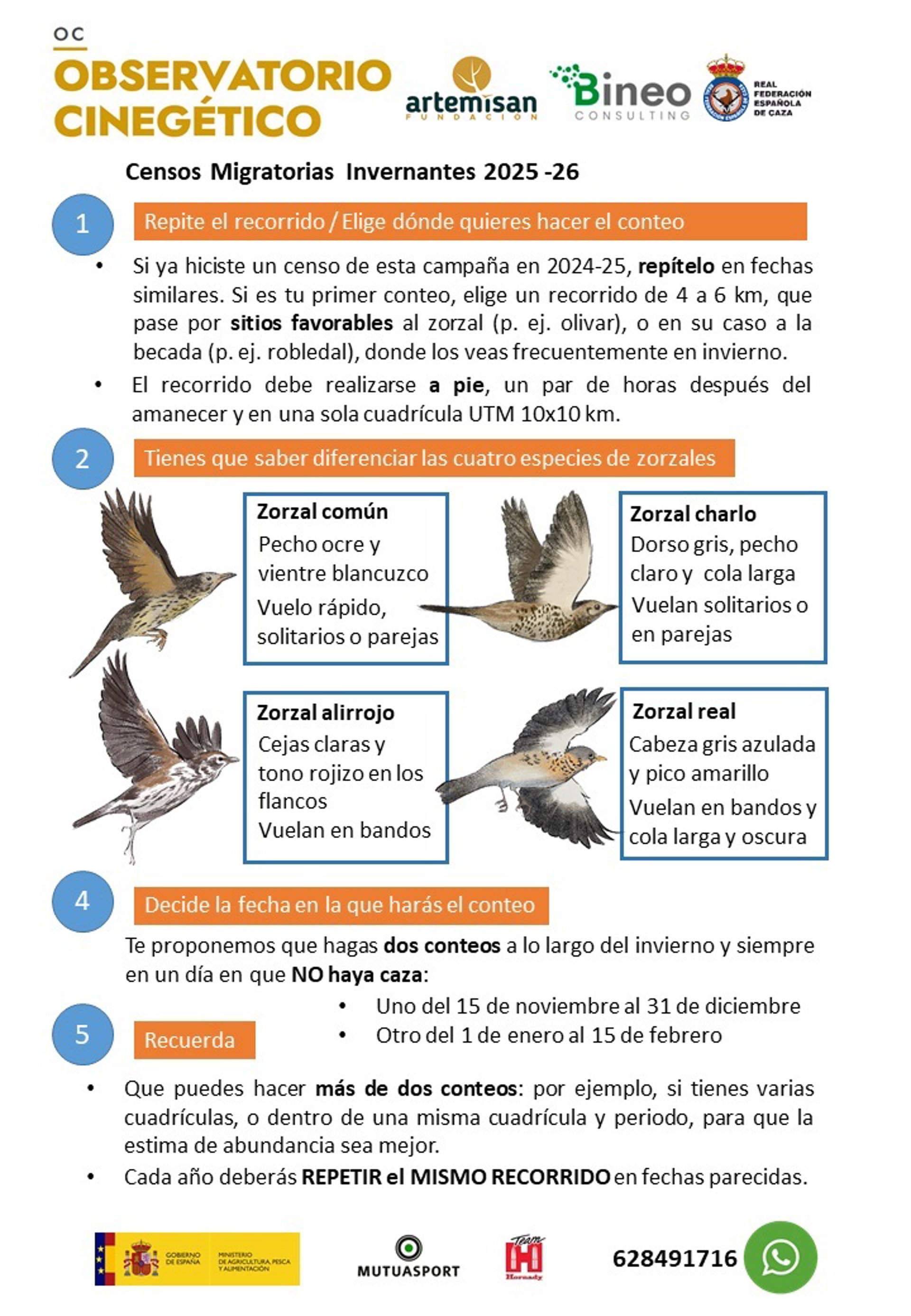 El Observatorio Cinegético comenzará este sábado día 15 de noviembre una nueva campaña de censos de aves migratorias invernantes. En concreto, se centrará en las distintas especies de zorzales: común, charlo, alirrojo y real; y en la becada, que se prolongará hasta el 15 de febrero de 2026.