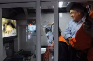 El presidente de Chile, Sebastián Piñera, viendo las imágenes de los mineros atr