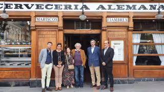 Ramón Buckley, en el medio, junto a miembros de Soy de la Cuesta, Barrio de Las Letras y Cervecería la Alemana en la presentación del programa '100 años de Hemingway en España'.