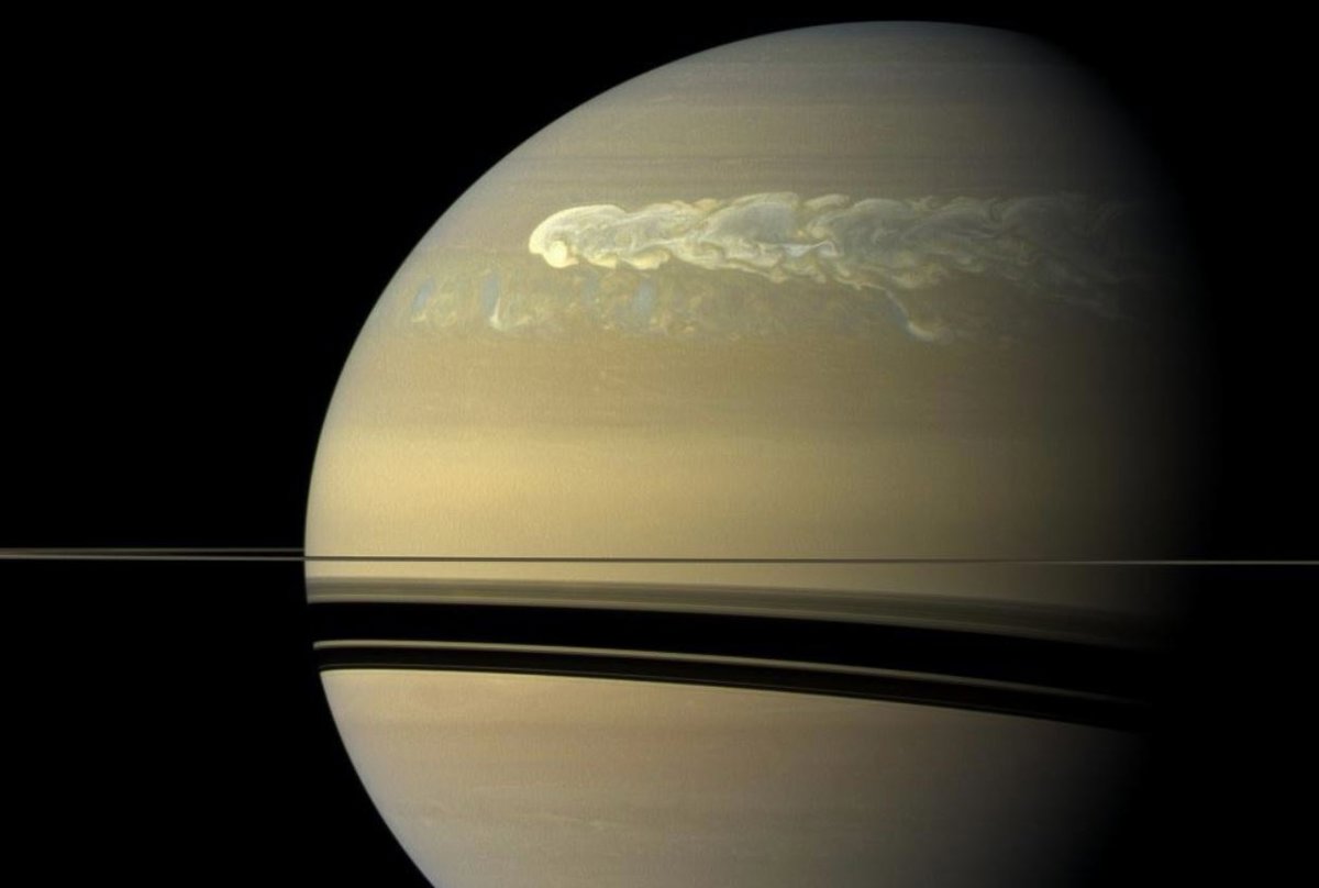 Archivo - Una gran tormenta domina la superficie sin rasgos distintivos de Saturno en una imagen tomada por la nave espacial Cassini el 25 de febrero de 2011