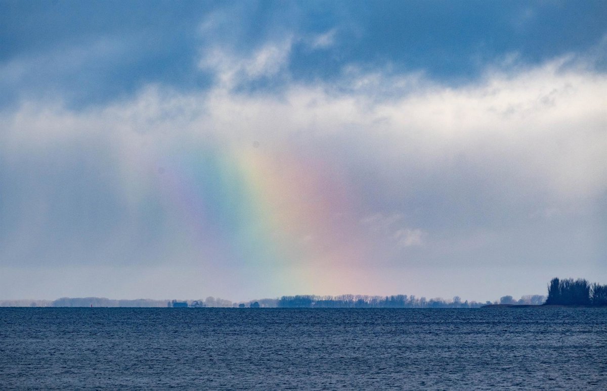 18 November 2025, Mecklenburg-Western Pomerania, Stralsund: Clouds and a rainbow move across the Strelasund off the island of Ruegen in Stralsund. Photo: Stefan Sauer/dpa