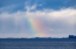 18 November 2025, Mecklenburg-Western Pomerania, Stralsund: Clouds and a rainbow move across the Strelasund off the island of Ruegen in Stralsund. Photo: Stefan Sauer/dpa - Stefan Sauer/dpa