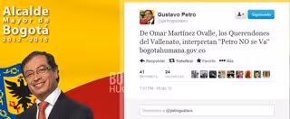 "De Omar Martínez Ovalle, los Querendones del Vallenato, interpretan 'Petro NO se Va'" escribe el alcalde en su cuenta oficial de Twitter con la 'url' de la canción https://soundcloud.com/he-rdek-guti-rrez-mendoza/petro-no-se...