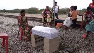 "Una tiene que seguir adelante, por sus otros niños. Hay que ser fuerte. Yo soy fuerte", dice la wayúu Sonia Epieyú, mientras vela a su hijo de apenas nueve meses de edad sobre las vías del tren que conduce a la mina de carbón El Cerrejón.