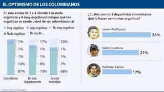 Los datos del estudio que se recogieron entre 9 y 16 de abril en 12 de este año en 12 ciudades visualizaron que la lista de deportistas que mayor orgullo generan son: James Rodríguez (28%), Nairo Quintana (21%), Falcao García (17%). En el mismo aspecto pero con cantantes musicales, Juanes (21%), Carlos Vives (19%) y Shakira (17%) fueron los que llevaron la delantera.