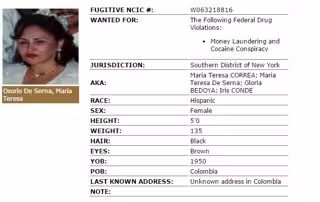 Identificada como María Teresa Osorio de la Serna, aparece en primer lugar en la lista de personas más buscadas por la DEA, seguida del narcotraficante John Alexander Thompson, que junto al ya capturado 'El Chapo' Guzmán, formaban el tridente de los fugitivos internacionales más buscados.