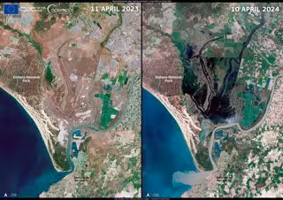 Copernicus ha publicado una imagen de satélite que muestra el estado que tenía el Parque Nacional de Doñana el 11 de abril de 2023 y el estado que tenía un año más tarde, el 10 de abril de 2024.