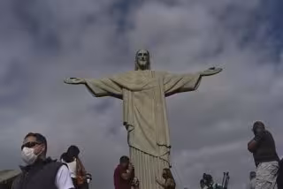 Personas con mascarilla por el coronavirus junto al Cristo del Corcovado de Río de Janeiro
