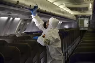 Un trabajador limpia el interior de un avión en el aeropuerto de Bogotá