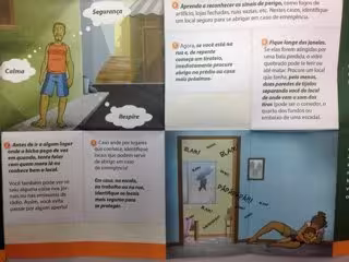 "Intentar correr hacia casa durante un tiroteo es peor. Permanece atento en casos de tiros disparados al aire. Al final, ¡todo lo que sube baja!", recoge el cómic, que aconseja refugiarse en el lugar cerrado más cercano, pero lejos de las ventanas.