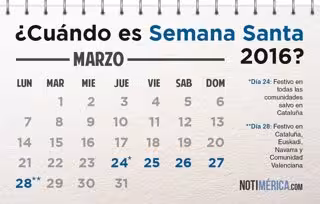 Este año la Semana Santa, que según la tradición de la Iglesia Católica tiene su inicio en el Domingo de Ramos, cuando Jesús entra en Jerusalén, comenzará a finales de marzo. Más concretamente, el domingo 20. A nivel nacional, el 24, Jueves Santo, es festivo en todas las Comunidades Autónomas salvo en Cataluña, mientras que el 25, Viernes Santo, el 26, Sábado Santo y el 27, Domingo de Pascua, lo son en todo el país.