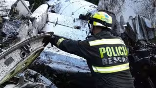 Un policía revisa los restos del avión del Chapecoense siniestrado en Antioquia