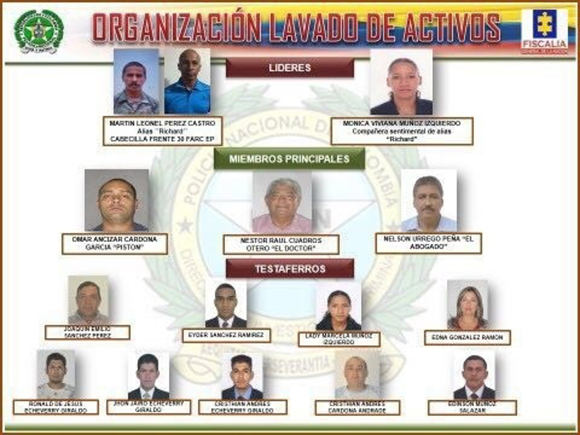 "Seguimos en la búsqueda de los dineros y finanzas ilícitas de las organizaciones delincuenciales", dijo Perdomo, quien indicó que los presuntos testaferros estaban dirigidos por Martín Leonel Pérez, alias 'Richard', cabecilla del frente 30 de las FARC.