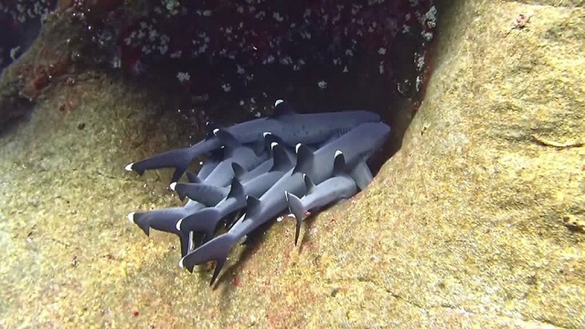 Durante el día, los tiburones de arrecife de punta blanca pasan gran parte de su tiempo descansando en los salientes de las paredes que surgen del fondo del océano.