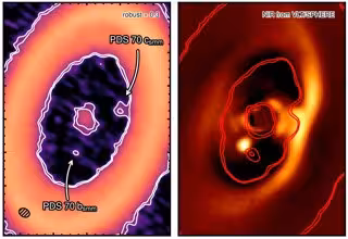 PDS 70 es una estrella enana de aproximadamente tres cuartos de la masa del sol. Sus dos planetas son 5-10 veces más grandes que Júpiter, y el más interno, el PDS 70b, orbita alrededor de 2.600 millones de kilómetros de la estrella, aproximadamente la distancia desde el sol hasta Urano. PDS 70 c está a 1.500 millones de kilómetros más lejos, en una órbita del tamaño de Neptuno.