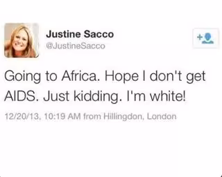 Justin Sacco, directora de Comunicaciones de la empresa de Internet 'InterActiveCorp' (IAC), se dirigía el pasado viernes a Sudáfrica para tomarse unas largas vacaciones. En el avión, que cubría la ruta entre Londres y Ciudad del Cabo, Sacco había posteado: "Rumbo a África. Espero que no pesque el sida. Es broma. ¡Soy blanca!".