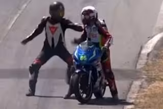 Antes de caerse, el piloto alcanzó a agarrarse de Calvo y como pudo se mantuvo encima de la moto de su rival, quien logró mantener el control hasta detenerse casi al final de la recta.