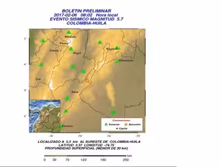 Según el Servicio Geológico Colombiano "a las 08:02 se presentó un sismo de magnitud 5,7 con epicentro a 5 km al sureste de la cabecera municipal de Colombia Huila". El sismo se sintió en Villavicencio (Meta), Cali (Valle Del Cauca), Bogotá, Ibagué (Tolima), Neiva (Huila), Tunja (Boyacá), Pereira (Risaralda), Armenia (Quindío).