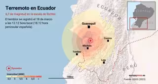 Mapa que representa la localización del terremoto de 6,7 de magnitud en la escala de Richter que ha sacudido este sábado la costa del Pacífico ecuatoriano.