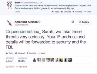American Airlines respondió a la niña en un tuit que ha sido borrado, diciendo que sus detalles se enviarían al FBI.