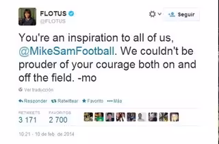 "Eres una inspiración para todos nosotros" han sido las palabras de apoyo de la Primera Dama estadounidense Michelle Obama para el jugador de fútbol americano Michael Sam, quien anunció este domingo que es "orgullosamente gay".