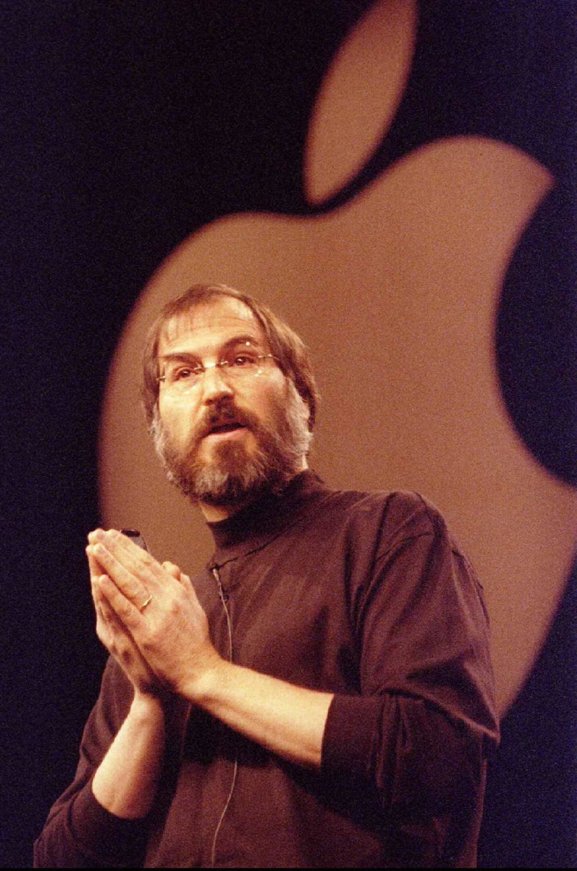 APPLE CEO JOBS SPEAKS IN FRONT OF COMPANY LOGO