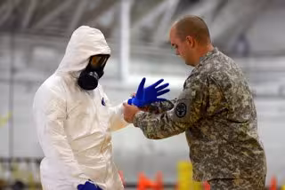 Un militar estadounidense ayuda a otro a ponerse un traje contra el ébola