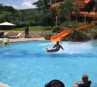 El mago se ha lanza por un tobogán pero de manera muy diferente a como solemos hacer el resto de los mortales, que es caer hasta el fondo de la piscina. Sin embargo, este artista se desliza como si tuviese una plancha hasta el borde y sale del agua, como si nada hubiera pasado.