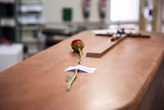 Detalle de la rosa, que los Servicios Funerarios de Madrid colocan sobre cada féretro, en la sala previa a la incineración en el Crematorio de la Almudena durante la pandemia de coronavirus en Madrid, España, a 13 de abril de 2020.