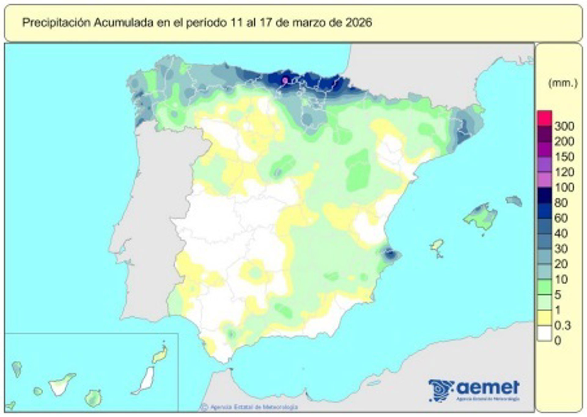 Durante el periodo comprendido entre el 11 y el 17 de marzo, las precipitaciones afectaron a la mayor parte de la Península, excepto el cuadrante suroeste y algunas áreas del Levante. En ambos archipiélagos también se registraron precipitaciones, salvo en la mitad sur de Tenerife y en la isla de Fuerteventura.