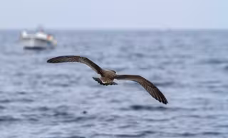 Pardela cenicienta con una barca de artes menores al fondo, en aguas del Espacio Marino de la Costa Central Catalana. - PEP ARCOS - SEO/BIRDLIFE