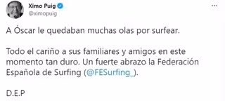 Así lo ha manifestado el jefe del Consell en una publicación en su cuenta en la red social Twitter, en la que también ha transmitido "todo el cariño a sus familiares y amigos en este momento tan duro" y ha enviado "un fuerte abrazo la Federación Española de Surfing".