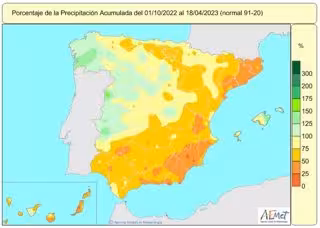 La falta de lluvias acumulada en España desde que el pasado 1 de octubre comenzó el año hidrológico hasta el 18 de abril alcanza el 23 por ciento, ya que se ha recogido un valor medio de 337 litros por metro cuadrado, cuando lo normal para este periodo serían 440 litros por metro cuadrado, según la Agencia Estatal de Meteorología (AEMET).