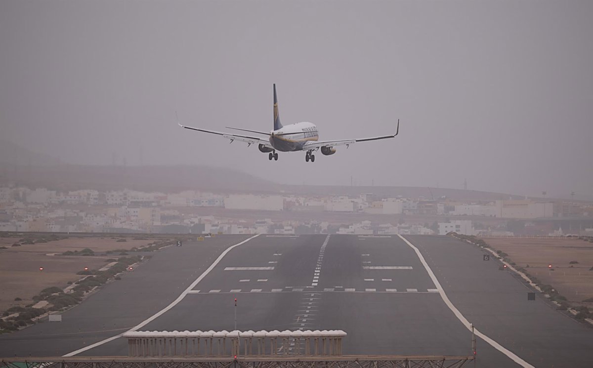Archivo - Un avión despega en el aeropuerto de Fuerteventura con calima, a 27 de diciembre de 2022, en Fuerteventura, Las Palmas, Islas Canarias (España). El viento de hoy ha causado más de 125 incidentes, como caídas de ramas de árboles, palmeras, postes - Europa Press - Archivo