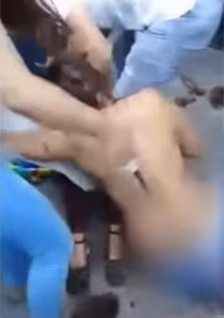 Las mujeres, además de ser pateadas e insultadas, se encuentran desnudas ante la multitud y les cortan el cabello para exacerbar aún más la humillación a la que están siendo sometidas.