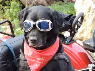 Finalmente, y cuando hubo preparado bien al perro para que no se cayera del vehículo, no pasara frío ni se le metiera nada en los ojos, el motorista se puso su equipo de seguridad, se montó en su moto y se marchó junto con su perro.