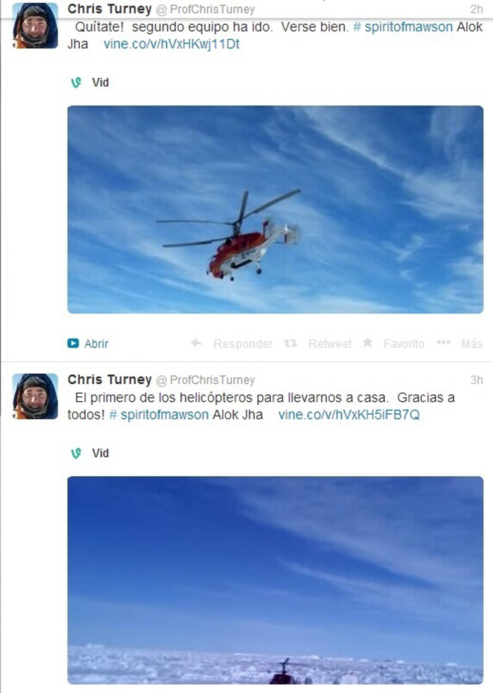 En la red de microblogging, el científico explicaba que el primer helicóptero para llevarles a casa había llegado y también informaba de la llegada de una segunda aeronave. En ambos casos, acompañaba los 'tuits' con fotografías.