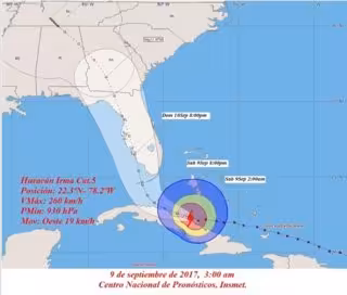 Durante la noche del viernes al sábado, la tormenta ha aumentado sus vientos máximos sostenidos de hasta 260 kilómetros por hora, con rachas superiores y una presión mínima de 924 hectopascales, por lo que nuevamente ha sido catalogado como huracán categoría cinco de la escala Saffir-Simpson. 'Irma' está avanzando hacia el oeste a unos 20 kilómetros por hora.