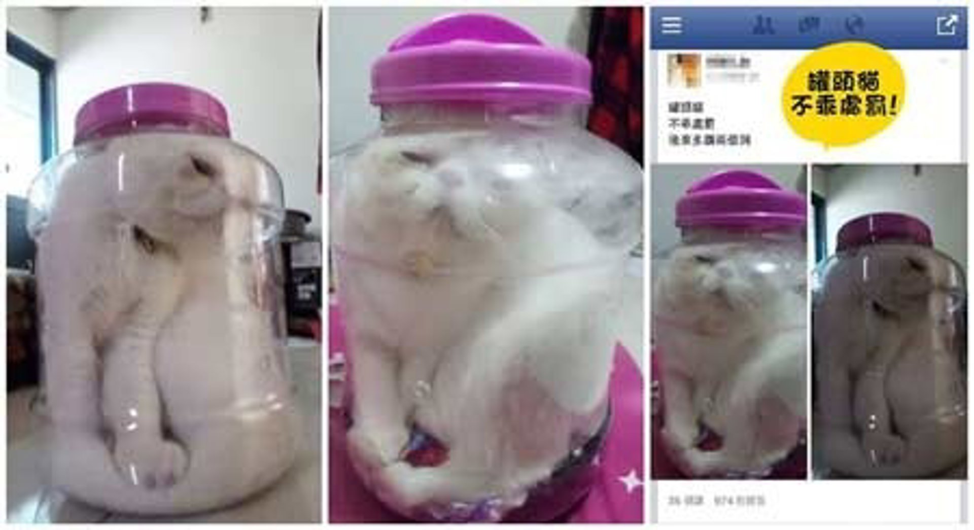 Una estudiante universitaria de Taiwan, Kiki Lin, fue denunciada por sus amigos por publicar en Facebook una foto de su gato dentro de un frasco de vidrio.