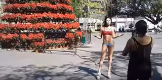 En un video que circula en YouTube se observa el momento en que la mujer llega a la plaza y se quita el vestido. Debajo lleva un sostén rojo y un bikini azul.