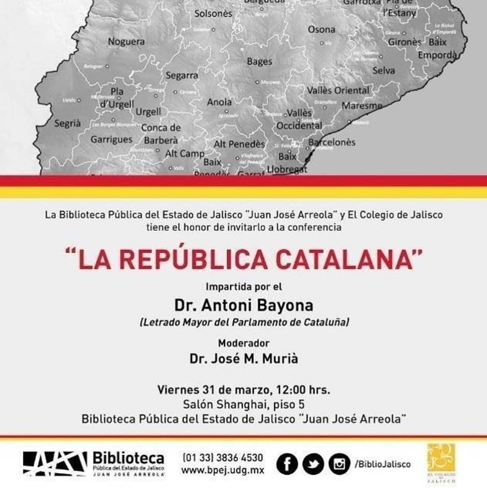 El letrado mayor del Parlament, Antoni Bayona, imparte este viernes una conferencia bajo el título 'La República catalana' en la Biblioteca Pública del Estado de Jalisco Juan José Arreola de la Universidad de Guadalajara (México).