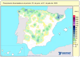 Durante el periodo del 25 de junio al 1 de julio las precipitaciones fueron dispersas y afectaron principalmente al tercio norte y al interior de la Península. Tanto en Baleares como en Canarias fueron escasas. Por zonas, se superaron los 10 l/m2 en puntos de Galicia y Asturias, en la mitad oeste de Cataluña y de manera más aislada en los Sistemas Central e Ibérico, en la provincia de Cuenca y en puntos del norte de Andalucía.