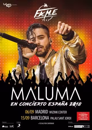 Maluma regresará a nuestro país en 2018 presentando su tour F.A.M.E. Los conciertos tendrán lugar el 6 de septiembre en el WiZink Center de Madrid y el 15 en el Palau Sant Jordi de Barcelona.