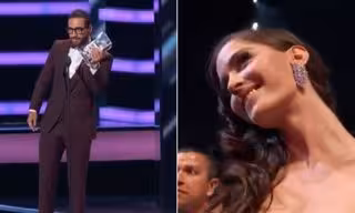 Cuando los presentadores de la categoría anunciaron el nombre del colombiano, este se puso de pie, recibió un beso de la modelo cubana y subió al escenario para dedicarle un mensaje a sus fans.