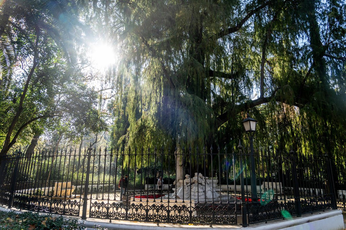 Archivo - Una pareja abrigada contempla el monumento a Bécquer, que se encuentra en el Parque de María Luisa, en un día frío y el soleado a la vez, a 27 de diciembre del 2023 en Sevilla (Andalucía, España). La capital andaluza despide el año con una ba - Eduardo Briones - Europa Press - Archivo