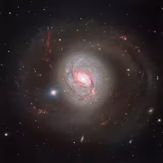 Esta imagen de Messier 77 fue tomada en cuatro bandas de diferentes longitudes de onda, representadas por los colores azul, rojo, violeta y rosado (hidrógeno alfa). Cada longitud de onda muestra una característica diferente: por ejemplo, los puntos rosados de hidrógeno alfa muestran las estrellas calientes y jóvenes que se están formando en los brazos espirales, mientras que en rojo vemos las finas estructuras filamentosas, parecidas a hilos, del gas que rodea a Messier 77. También vemos, en primer plano, una estrella de la Vía Láctea junto al centro de la galaxia, mostrando delatores picos de difracción. Además, pueden verse muchas más galaxias que, en las afueras de los brazos espirales, parecen pequeñas y delicadas en comparación con la colosal galaxia activa.