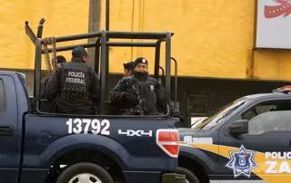 Mexican federal police ride in a vehicle as they patrol on a main avenue in Guad